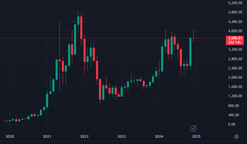 이더리움의 최고가는 2021년 11월의 4,877달러 정도입니다. 2024년에는 3월달의 4,098달러 정도가 최고가이기 때문에 2024년이 몇 일 남아있지 않은 지금 아직 이더리움은 신고가 갱신을 못하고 있는 상황이죠.