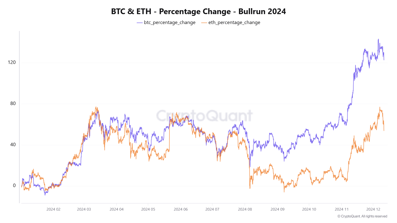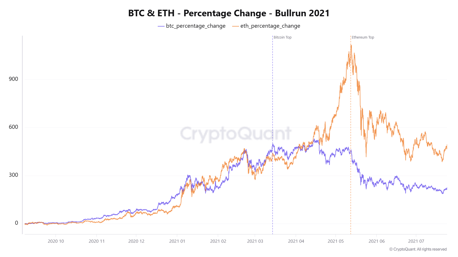 2020년 9월경부터 시작된 2021년 상승랠리 동안, 비트코인은 2021년 3월 13일에 사이클 시작 대비 480% 상승하며 사상 최고가(ATH)를 기록했습니다. 같은 시점에 이더리움은 427% 상승했습니다.