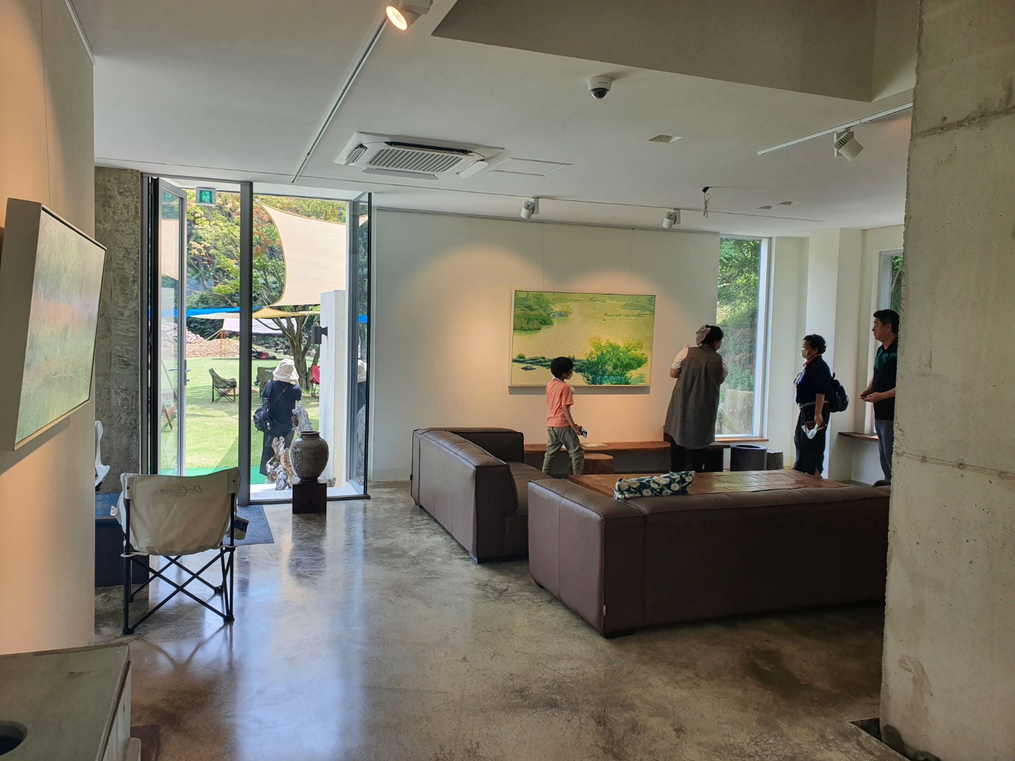 카페 건물 내부의 모습입니다. 갤러리 카페의 용도도 있는 것처럼 모던하고 고급스러운 인테리어가 차분한 느낌을 주고 있습니다. 실제 작가의 전시도 이루어지고 있구요. 넓은 통창으로 조경과 근처의 전체적인 뷰를 감상할 수 있어 그리 넓은 공간은 아니지만 전혀 답답하지 않은 느낌입니다.